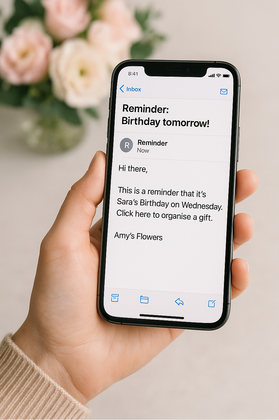 Life gets busy — and important dates can easily slip your mind. Our free reminder service makes it simple to stay organised and thoughtful all year round. Add your special dates to your Amy’s Flowers account and we’ll send you a friendly reminder before each one. You’ll have plenty of time to choose flowers or a gift and have it delivered on the day.