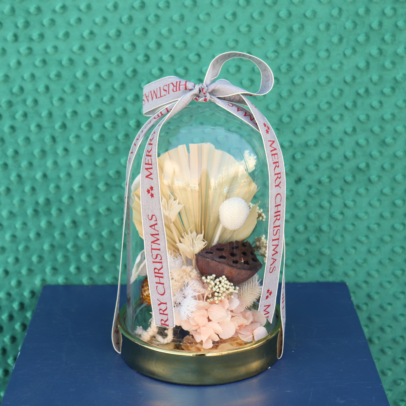 A timeless Christmas keepsake, Gilded Noel features dried blooms, lotus pods, and natural textures under a glass dome tied with a “Merry Christmas” ribbon. Elegant, earthy, and everlasting — the perfect festive décor or thoughtful gift.
