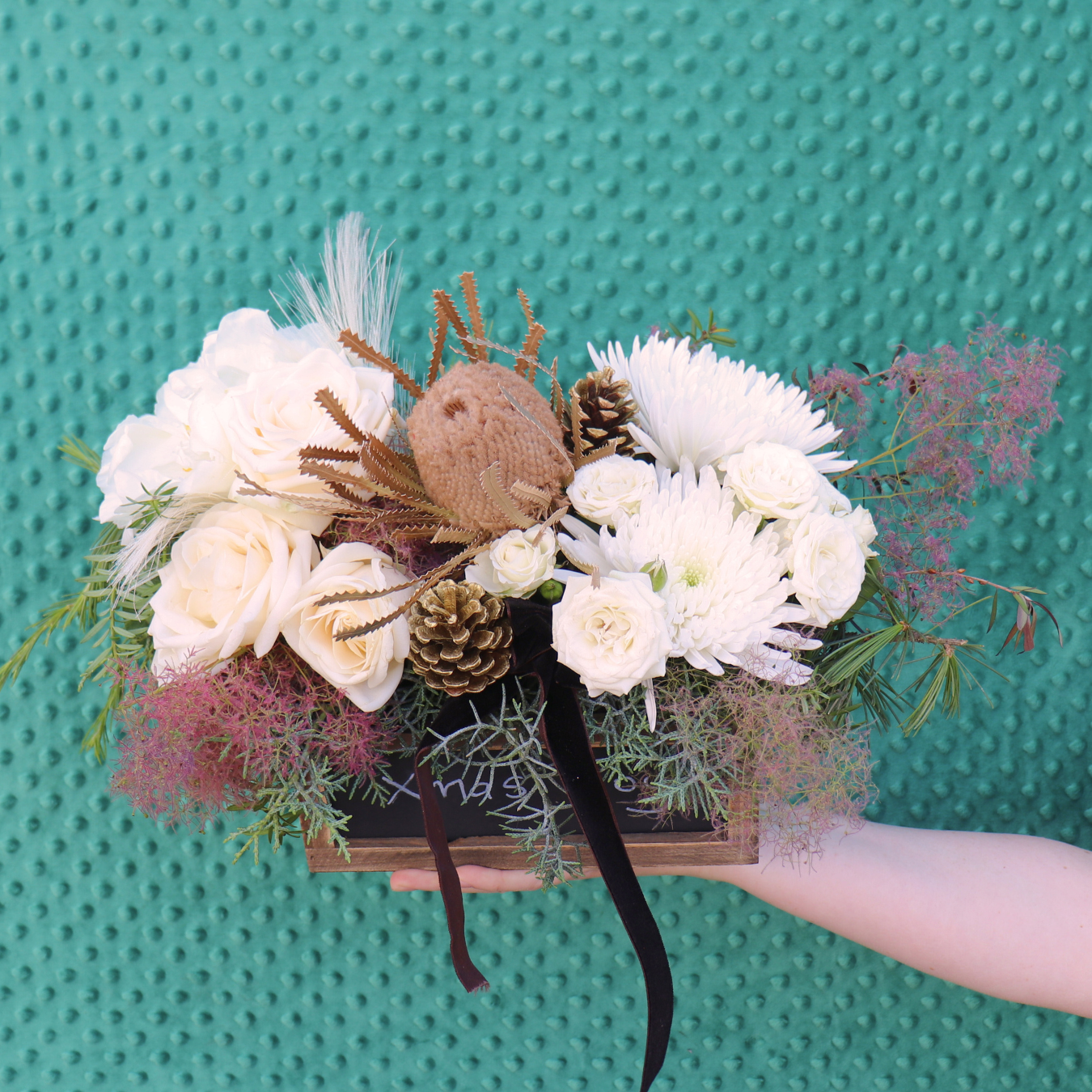 A modern take on Christmas elegance โ Noel Noir pairs creamy white florals with natural pinecones, textured foliage, and dark velvet ribbon. Refined and sophisticated, itโs a stunning addition to any holiday home. All presented in a keepsake chalkboard wooden trough - personalise your message on it!ย