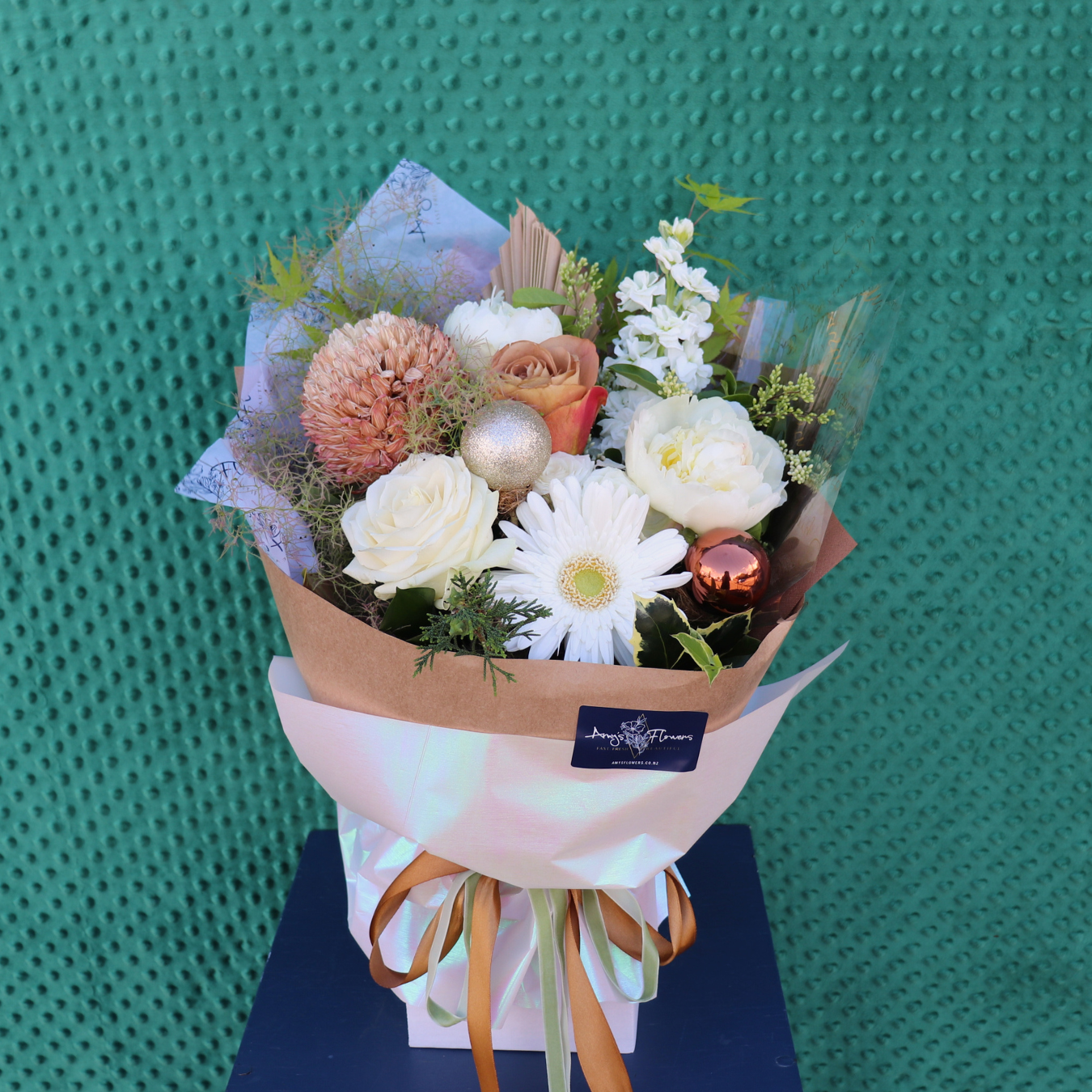 Warm, joyful, and full of festive texture — Spiced Cheer features rich white and caramel blooms with hints of gold and bronze. A modern, natural bouquet that embodies Christmas elegance. Presented in a water filled portable vase to ensure it last well and stays fresh.