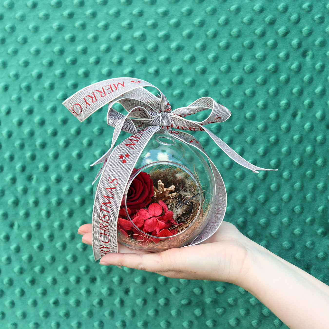 Timeless and elegant, Velvet Noel blends preserved roses and blooms in shades of red, white, and green with pinecones and rich velvet ribbon detailing. The ultimate statement of Christmas luxury that last forever!