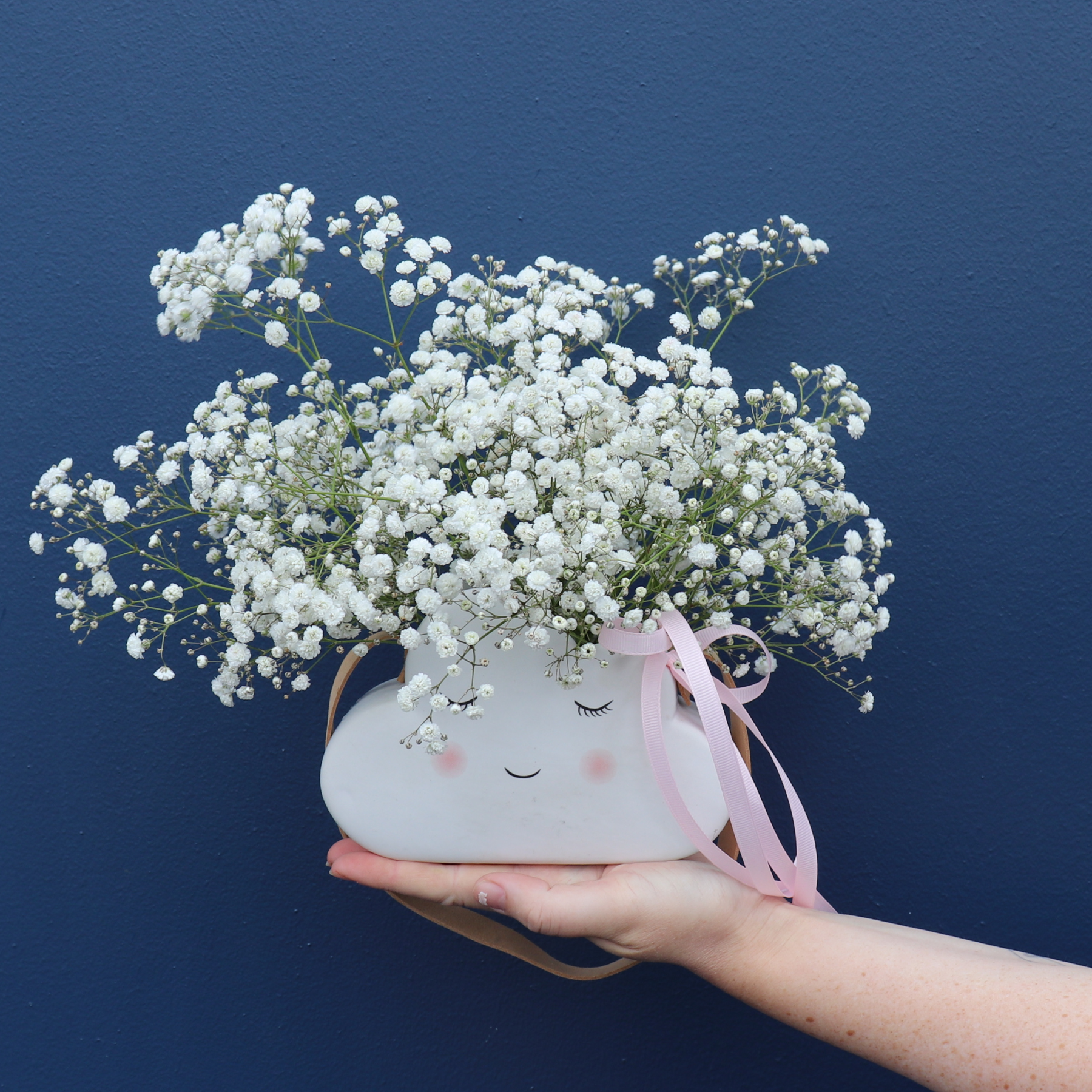 Sweet Dreams is a delicate cloud of fresh baby’s breath nestled into an adorable keepsake pot with the sweetest sleepy face. Light, airy and full of calm energy, this arrangement is designed to bring a sense of peace and joy to any space.