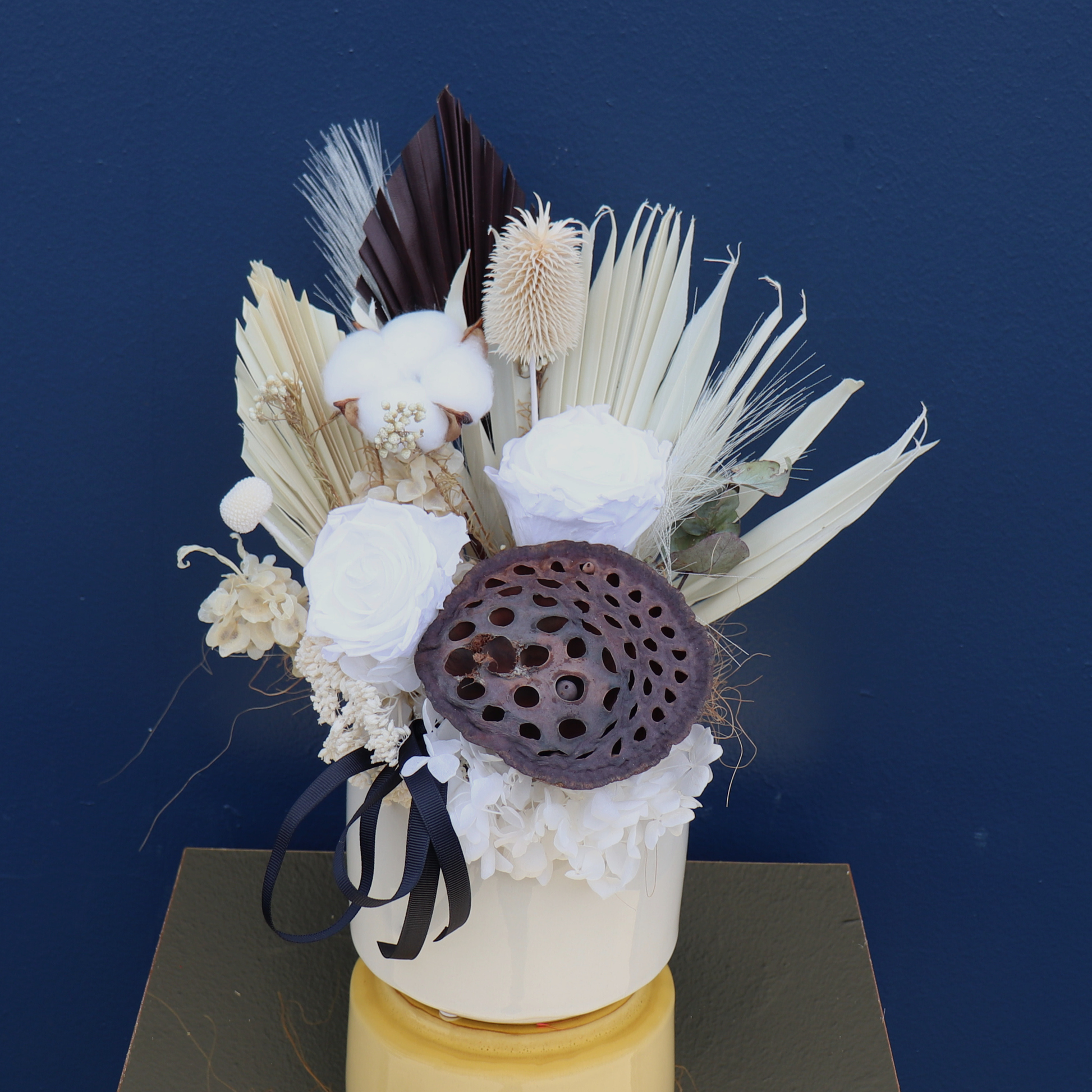 *All our preserved's are one off arrangements, styled by our talented florists. Please note that Ceramics and preserved flower types WILL vary due to availability but the color palate and style will remain similar.