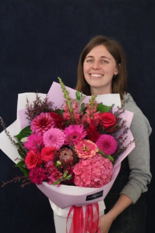 Crafted with care, this hand tied bouquet features a variety of beautiful seasonal flowers in a radiant mix pink tones. A customer favourite, this bouquet is one of our top-selling products.