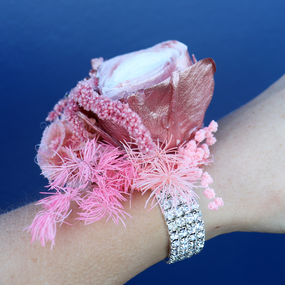 A dried and preserved wrist corsage in beautiful rose gold, rose pinks, and white. Option on a diamante bracelet or a silver elastic. Size Recommendations: Elastic fits a petite to medium wrist Diamante bracelet fits all.