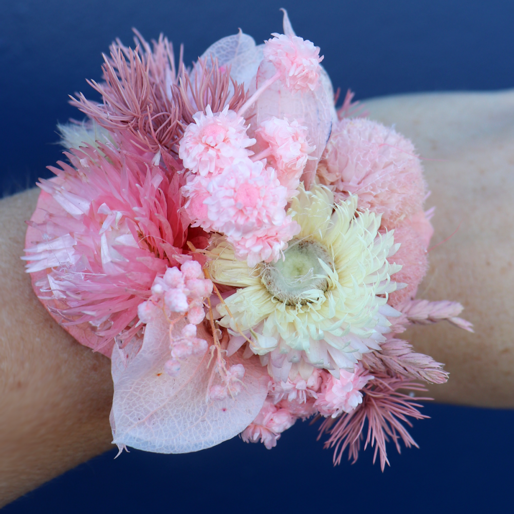 A dried and preserved wrist corsage in beautiful soft pinks, blush and white. Option on a diamante bracelet or a silver elastic. Size Recommendations: Elastic fits a petite to medium wrist Diamante bracelet fits all.