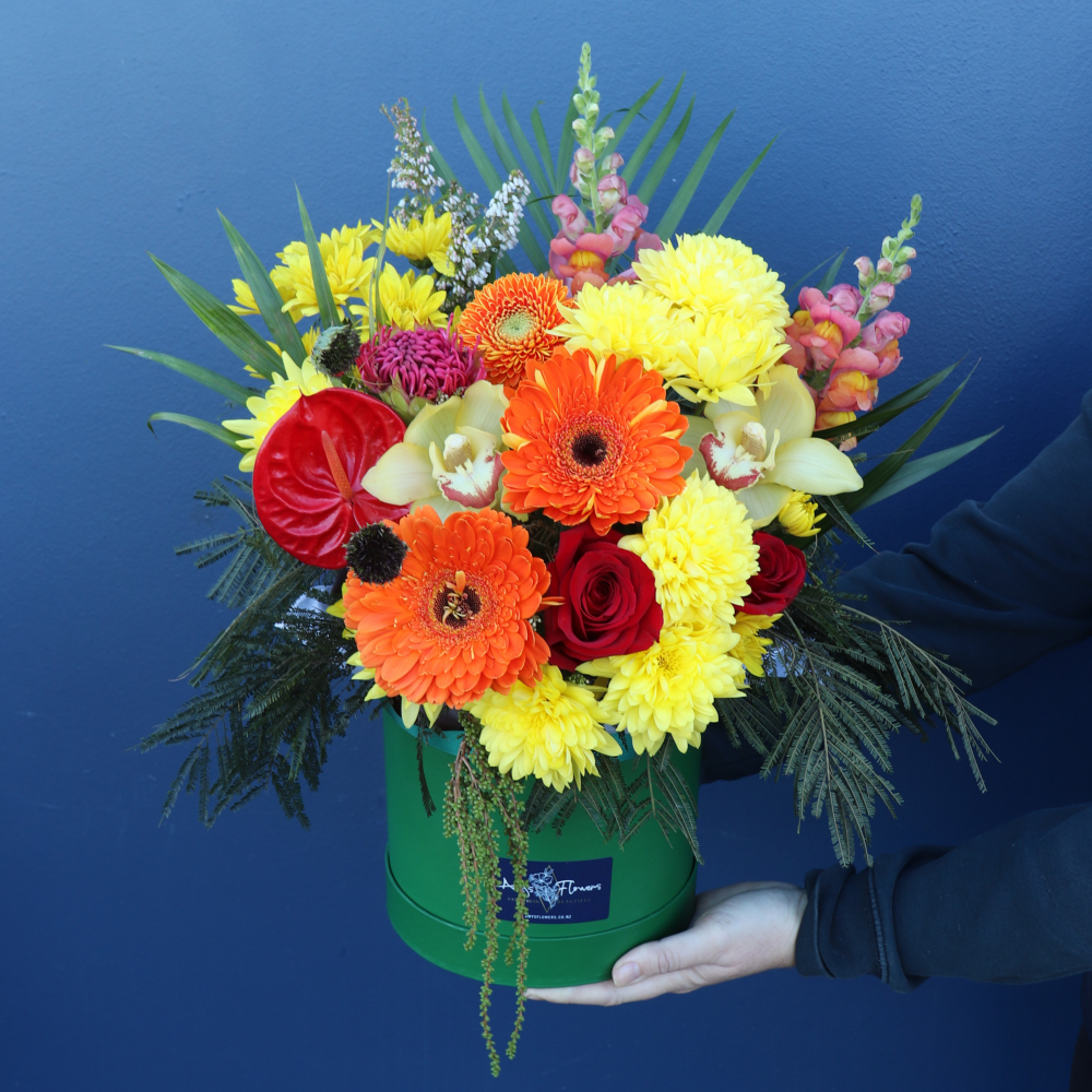 Orange, yellow and red tones, all arranged in an easy-care hatbox!