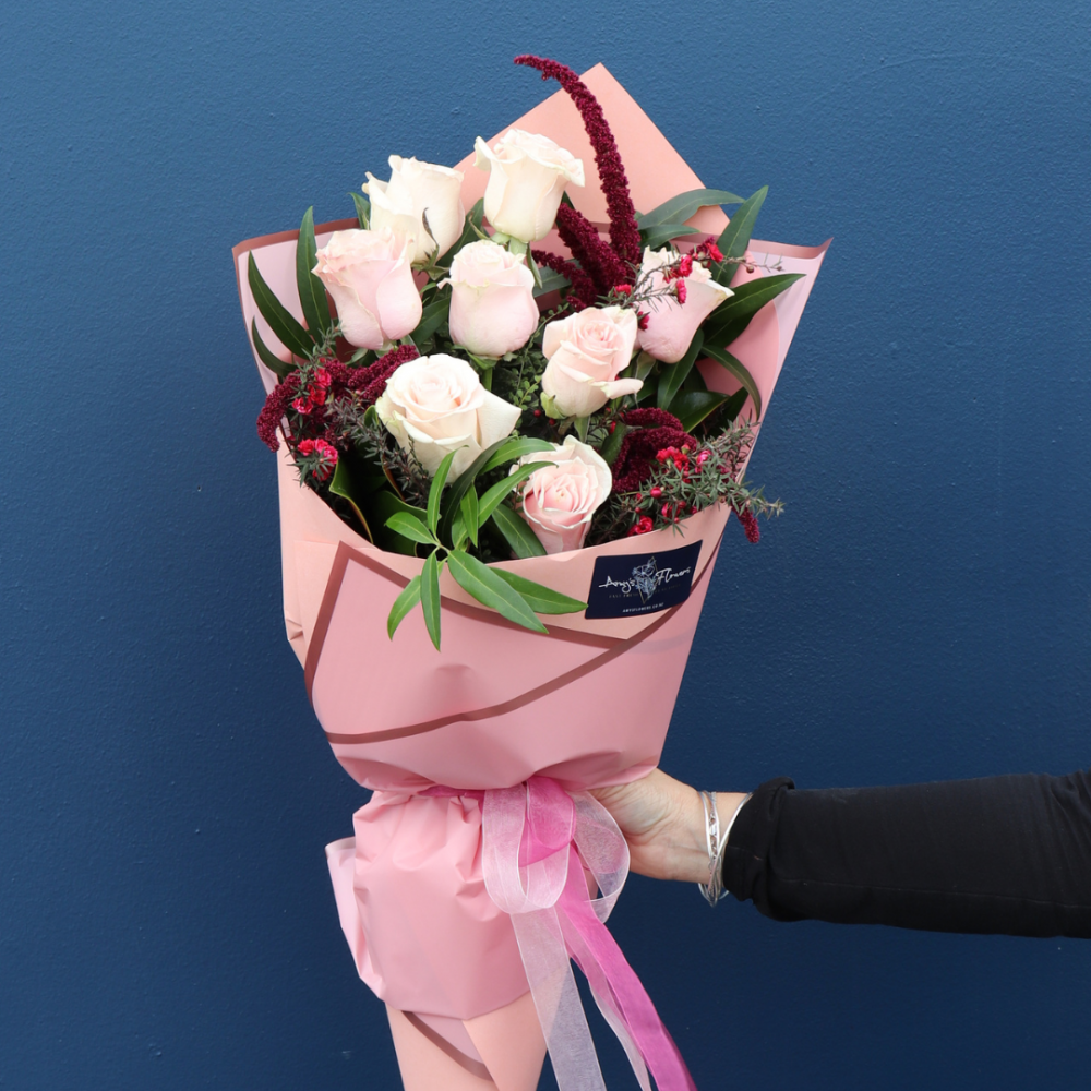 8 Stems of Stunning pale pink roses, with flowering foliage and all for only $79!!!
