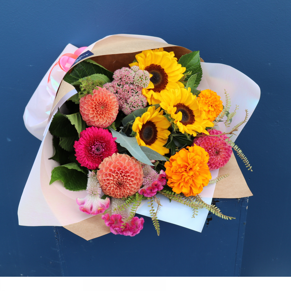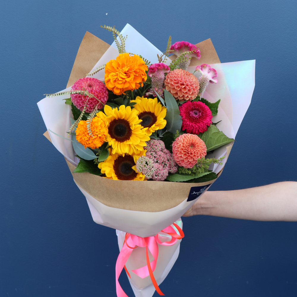 Featuring golden sunflowers, vibrant marigolds, hot pink gerberas and beautifully textured dahlias in peach and blush tones, this bouquet is designed to bring instant vibes!