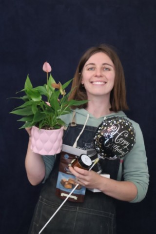 Accented with fresh greenery and wrapped in delicate iridescent wrap, it’s beautifully finished with a satin ribbon and presented in a contemporary glass vase with a natural wooden base — making it ready to gift and ready to display.