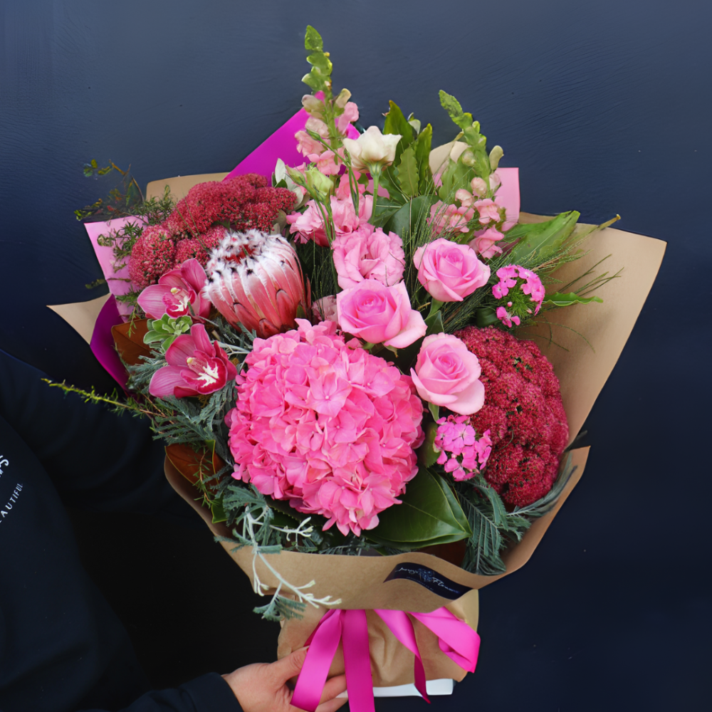 Crafted with care, this hand tied bouquet features a variety of beautiful seasonal flowers in a radiant mix pink tones. A customer favourite, this bouquet is one of our top-selling products.