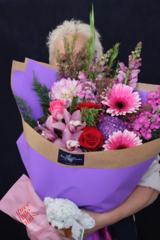Classic soft teddy bear ready for lots of cuddles! Your florist will choose a light or dark teddy to match baby's gift. NOTE - color and style may vary from what is pictured due to availability. 25-28cm approx.