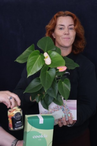 Stunning flowering Anthurium plants in ceramic pot. Mixed colors.