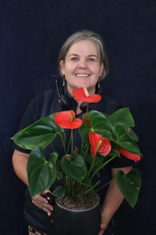 Stunning flowering Anthurium plants in ceramic pot. Mixed colors plants and pots.