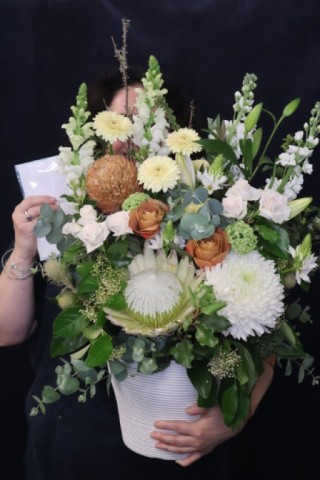 Gift some natural, rustic charm with this ceramic pot arrangement. Featuring whites, greens, and browns with unique textures and elements, it's ideal for both avid gardeners and those who appreciate a more rustic look. This floral arrangement is also suitable as meaningful gesture to send as sympathy or funeral flowers during times of grief.