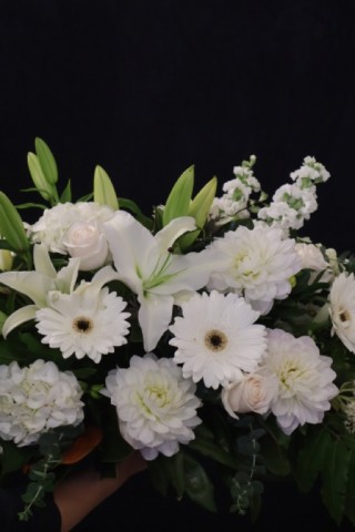 Traditional style display suitable as tribute flowers atop a casket for a funeral service.