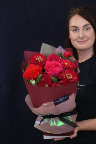 most beautiful seasonal blooms available on the day. Expect rich reds, pretty pinks, soft textures, and lush greenery — all thoughtfully arranged for maximum impact.