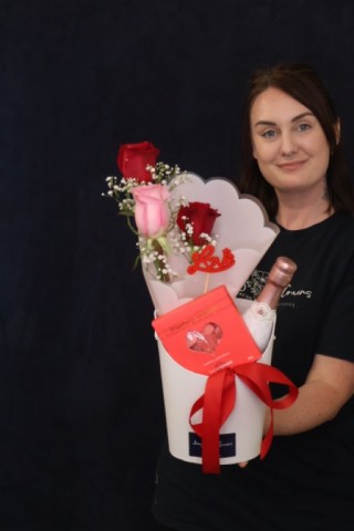 Paired with a mini sparkling wine and a box of sweet heart treats, this gift is perfect for romantic surprises, desk deliveries, or thoughtful moments that deserve something extra special.